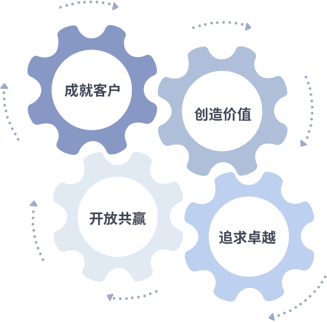成就客户是一切决策的出发点,,,,创造价值是衡量所有工作的标准,,追求卓越是我们做事做人的态度,,开放共赢是我们的格局也是最终的结果。。。。价值观的齿轮环环相扣,,,推动着组织里的每个人不断向前。。。。